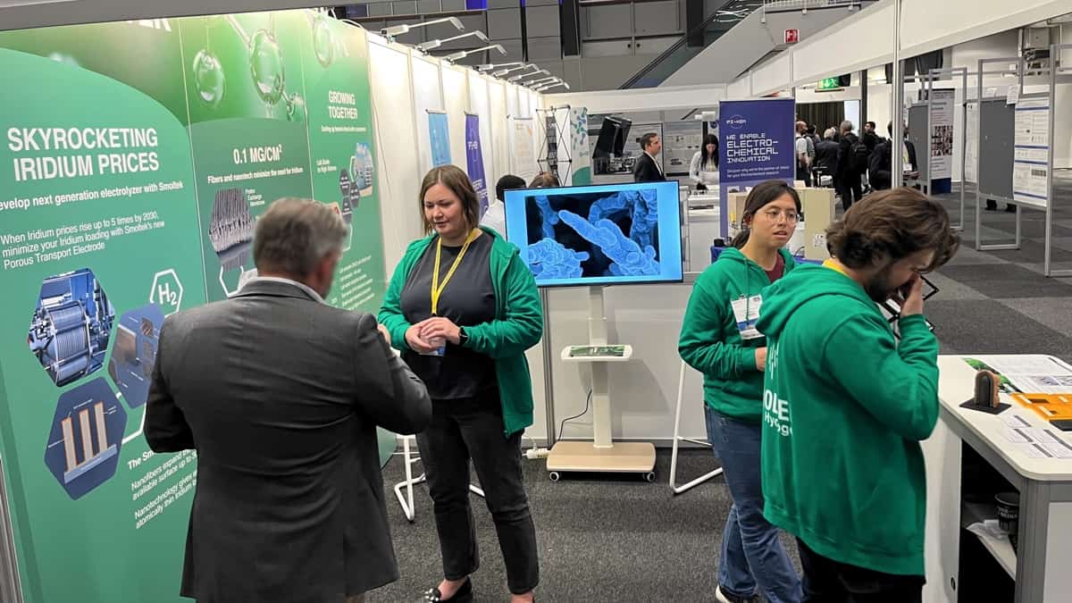 In our booth we had prepared well. We had a huge backdrop, that was an eye catcher as well as it gave an overview of what we are doing. A tv-screen where we showed presentation slides and a short looping film from our in-house H2LAB. We also had small physical samples of our cell material and a summarizing leaflet to hand out.
